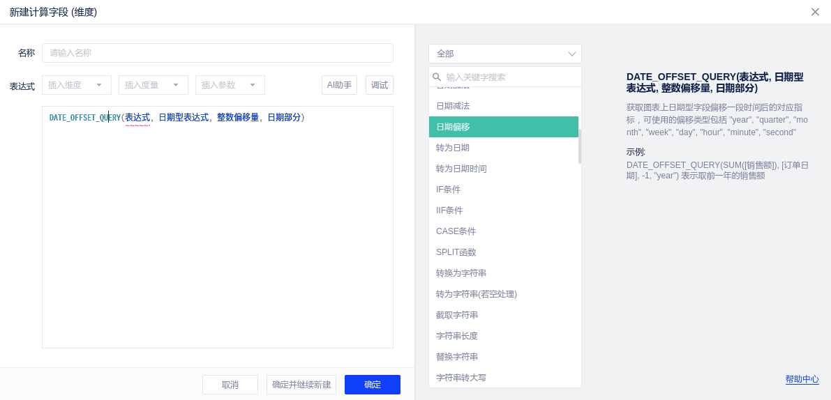 示例:DATE_OFFSET_QUERY(SUM([销售额]), [订单日期], -1, "year") 表示取前一年的销售额