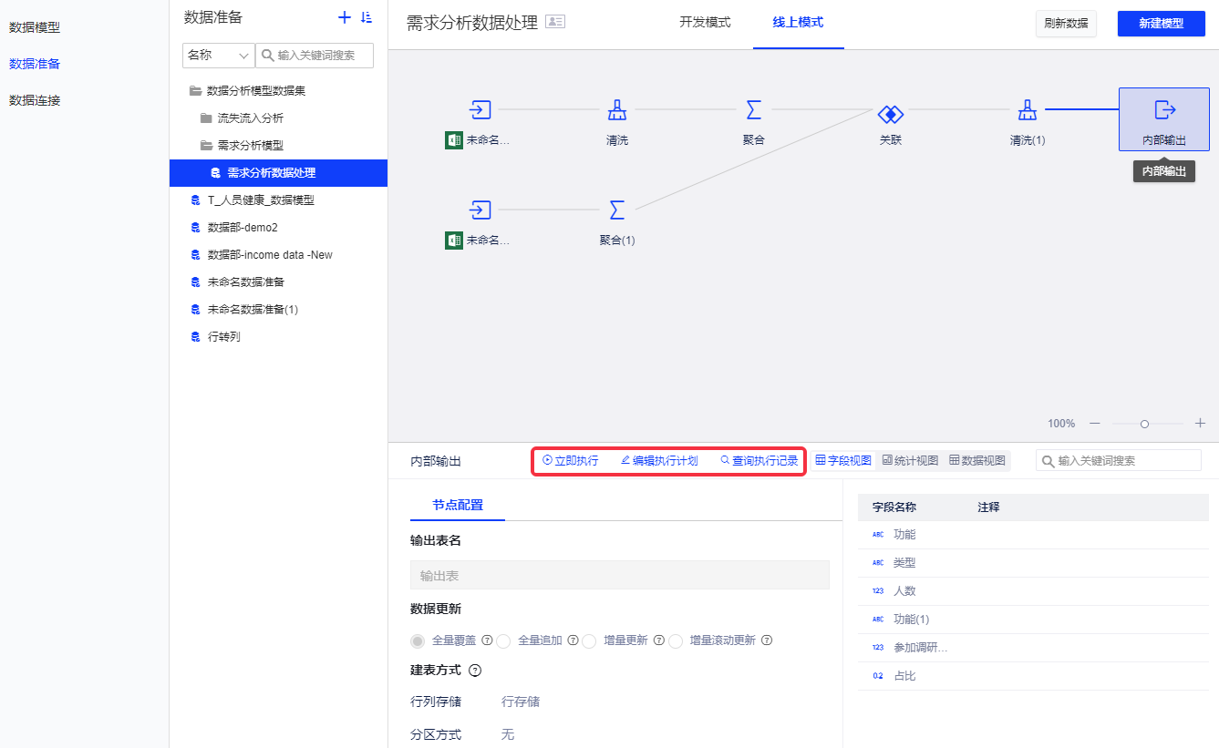 线上模式呈现发布后的流程,支持新建数据模型功能。您可在线上模式的输出节点中设置执行计划。