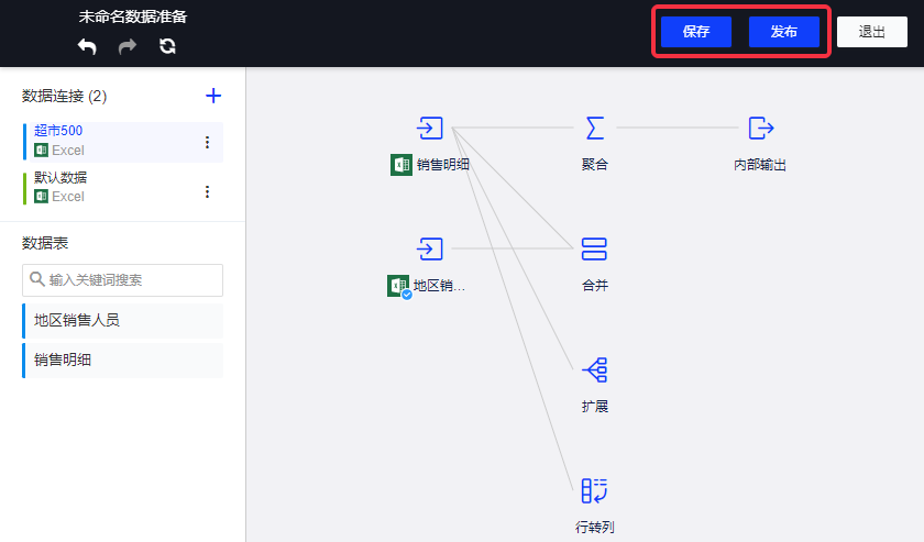 在完成数据准备工作后,需要将流程进行发布,才能进入到执行计划的编辑、数据模型的新建。您也可以选择暂时不进行发布,对当前的流程进行保存。