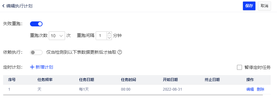 在编辑执行计划中,可以添加定时任务,支持设置依赖执行、任务频率、任务日期、任务时间、开始日期和终止日期。