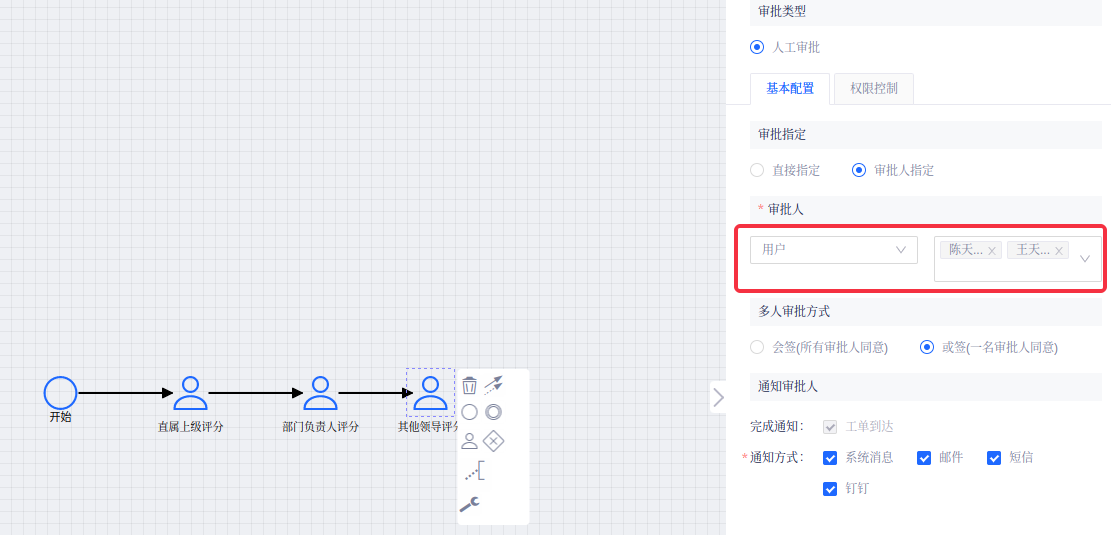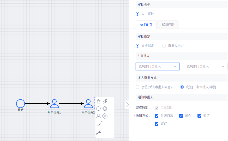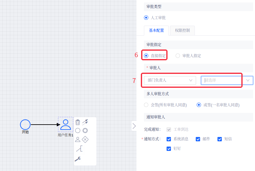 点击基本配置,将审批指定设置为“直接指定”,审批人设置为“部门负责人”,通知方式选填