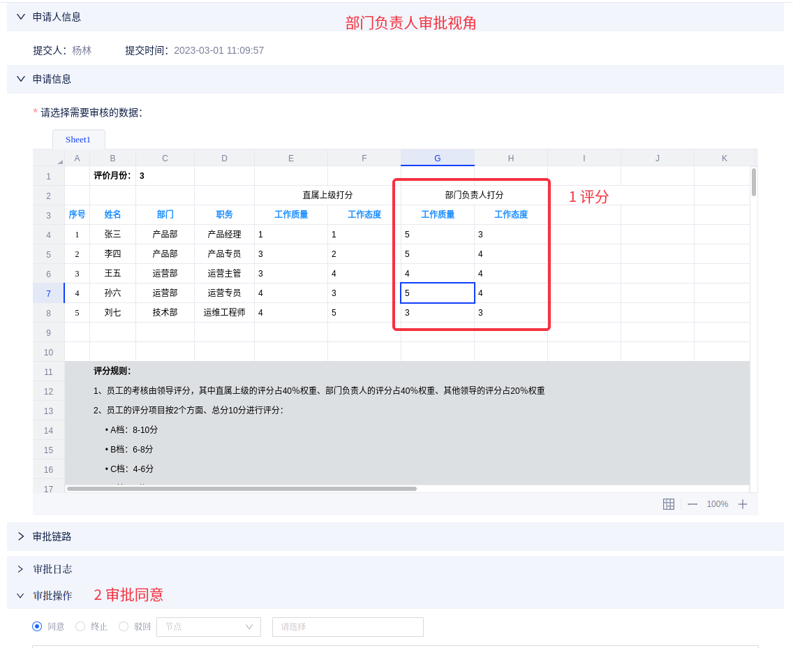 (3)下图为部门负责人审批视角,可以看到上一级的评分情况。点击同意后,流程将进入到其他领导评分环节