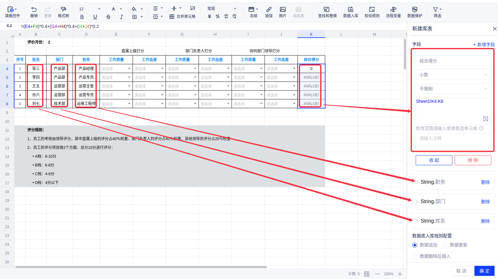 | K4:K8 | 添加公式:(E4+F4)0.4+(G4+H4)0.4+(I4+J4)*0.2 | 将用户录入的数据累计,得到汇算数据 |