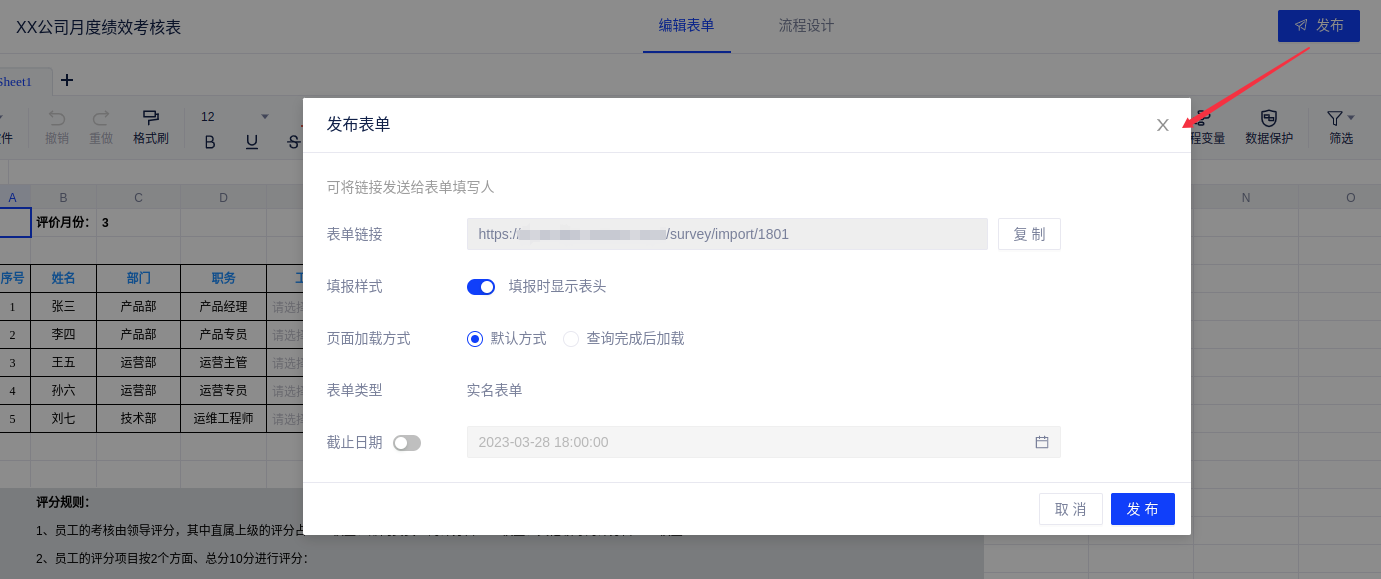 (1)新建一个制式表单,命名为“XX公司月度绩效考核表”,填报权限设置为实名