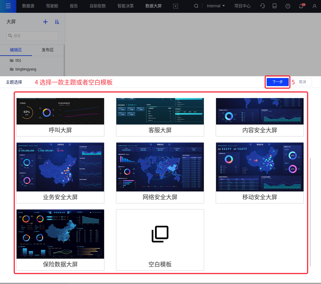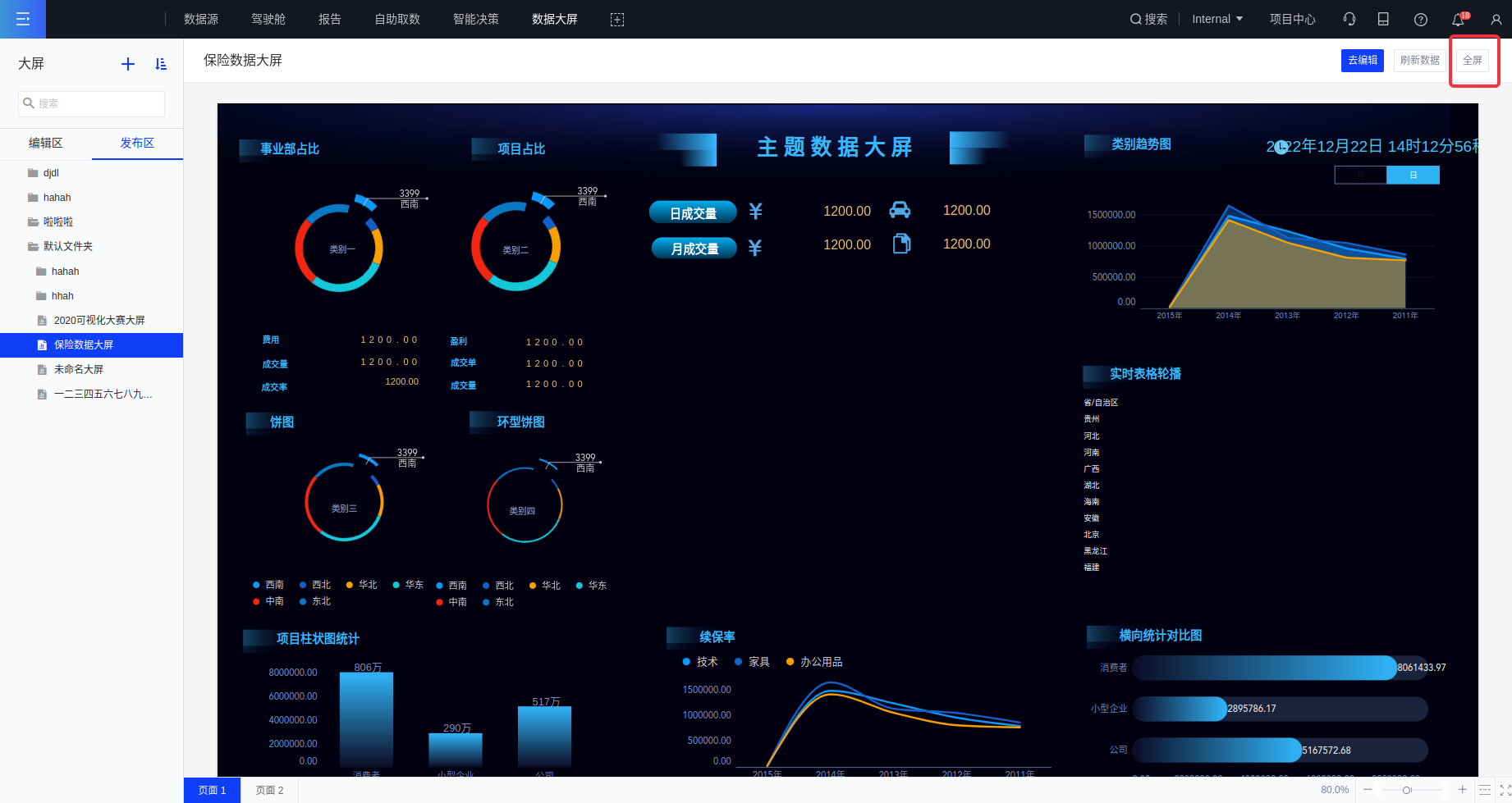 (3)出于演示需要,我们选择了“保险大屏”主题,然后进入大屏编辑页面;