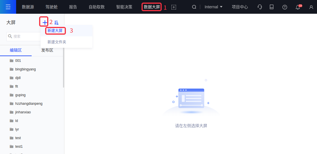 创建前提:您的操作帐号需为“创作者”。(1)登录本产品后,在数据大屏模块首页,点击“新建大屏”按钮;