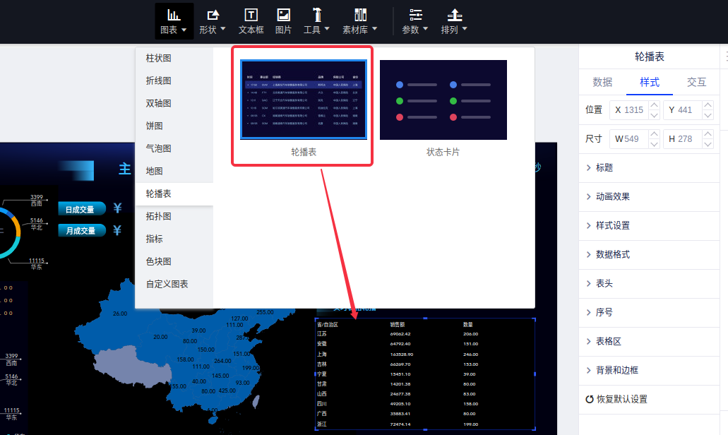 - ②大屏图表控件区:在建立大屏时,大屏中所需要的图表、形状、文本框、插入图片、插入素材以及更改图层排列顺序的操作都在这里,本区是大屏内容的发源处。