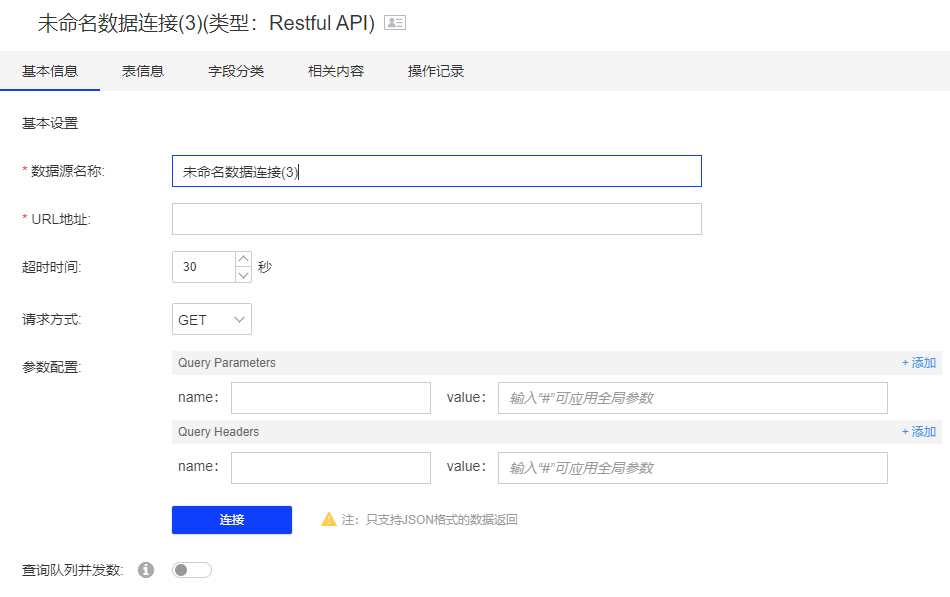 当您遇到有本产品不支持的数据源时,你可以在数据连接中创建Restful API来实现连接。