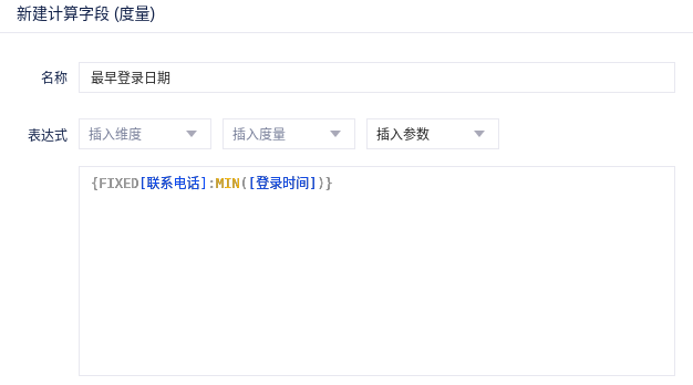 (1)新建一个名为“最早登录日期”的计算字段,用FIXED函数可以获取每个用户第一次登录日期,输入表达式{FIXED[联系电话]:MIN([登录时间])}