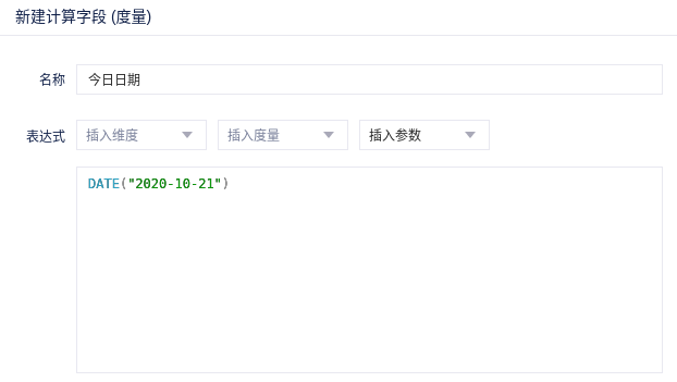 (2)新建一个名为“今日日期”的计算字段,由于这张示例表只有2020-10-21之前的数据,所以我们将2020-10-21作为“今日日期”,输入表达式DATE("2020-10-21")