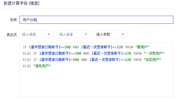 用户分类 = IF [最早登录日期距今]<=200 AND [最近一次登录距今]<=120 THEN "新用户" ELSE IF [最早登录日期距今]<=200 AND [最近一次登录距今]>120 THEN "一次性用户" ELSE IF [最早登录日期距今]>200 AND [最近一次登录距今]<=120 THEN "忠实用户" ELSE "流失用户"