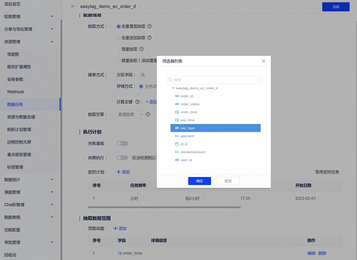1、数据抽取:抽取设置新增数据抽取范围,过滤掉过时和无效数据,提高抽取效率。在创建或编辑数据任务时,可在底部添加【抽取数据范围】,可选择当前表中的字段作为范围依据。