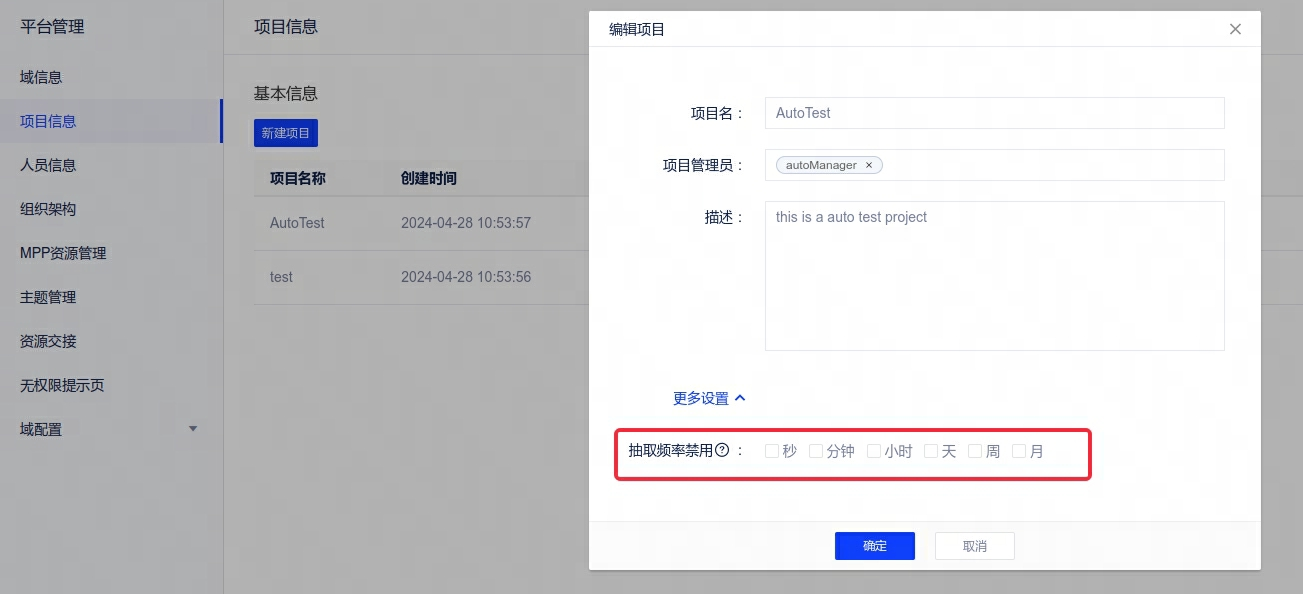 1、平台管理增加抽取频率配置,可控制项目内能够发起的抽取任务频率。若需禁止某个项目设置秒、分钟或小时等抽取任务频率,可在此勾选设置。