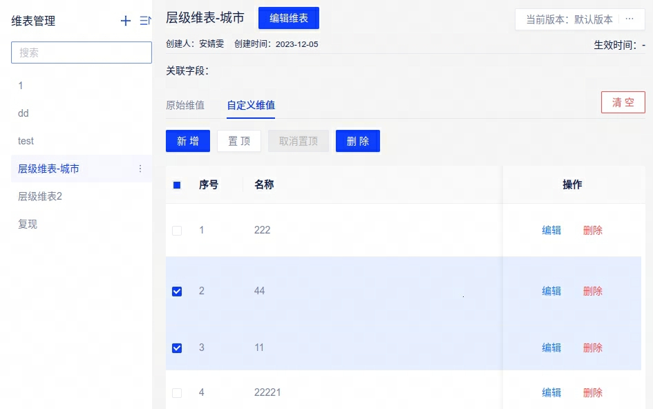 2、维表管理:自定义维值支持置顶和取消置顶,维值被设置置顶后,将会在维表展示列表中置顶显示。