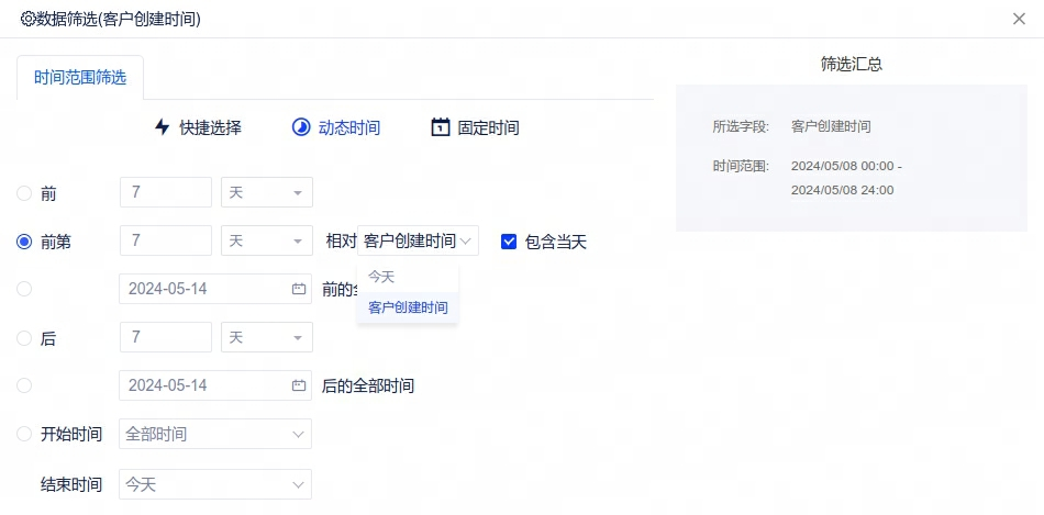 2、【日期筛选】动态时间相对日期新增”包含当天“,分析师筛选数据时可以选择指定日期范围中的当天。
