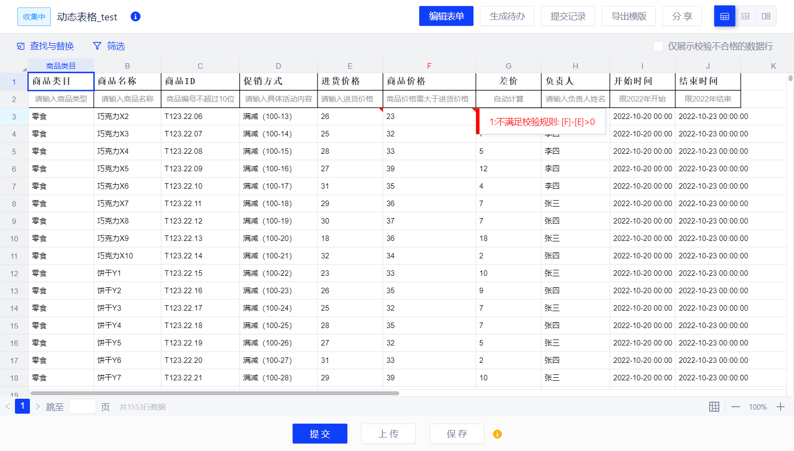 制式表单以在线表格为基础,通过自由设置数据区的位置从而实现更灵活的结构,按列上传数据实现快速数据写入,支持选项联动,支持计算控件。功能详情请查看动态表单。