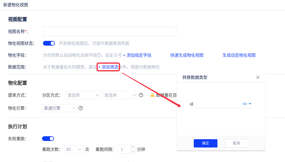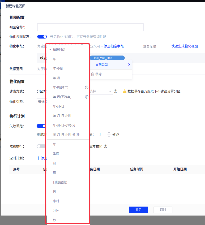 (5)字段选择新增“生成动态物化视图”。原先因为物化视图字段都是静态选项,当报告内容变化时物化视图会失效,由此产品新增“生成动态物化视图”功能以解决此类问题。