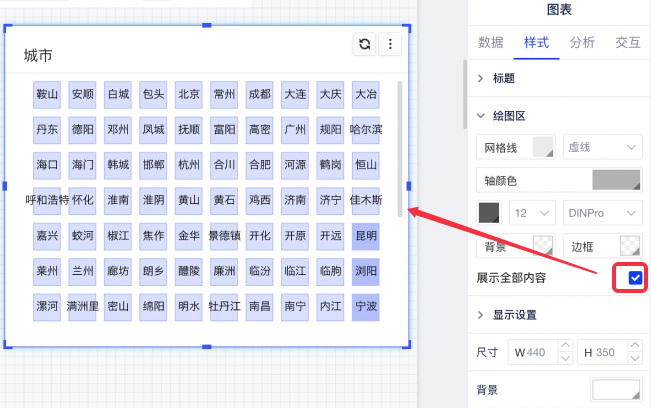 在图表样式 - 表格区/绘图区(auto表格/图表)下方新增[展示全部内容]勾选框。勾选后,图表右侧增加滚动条,当图表组件尺寸较小时可展示全部字段成员。