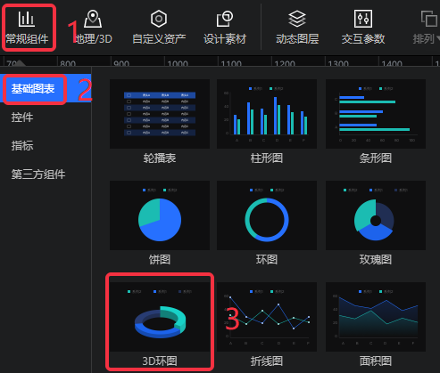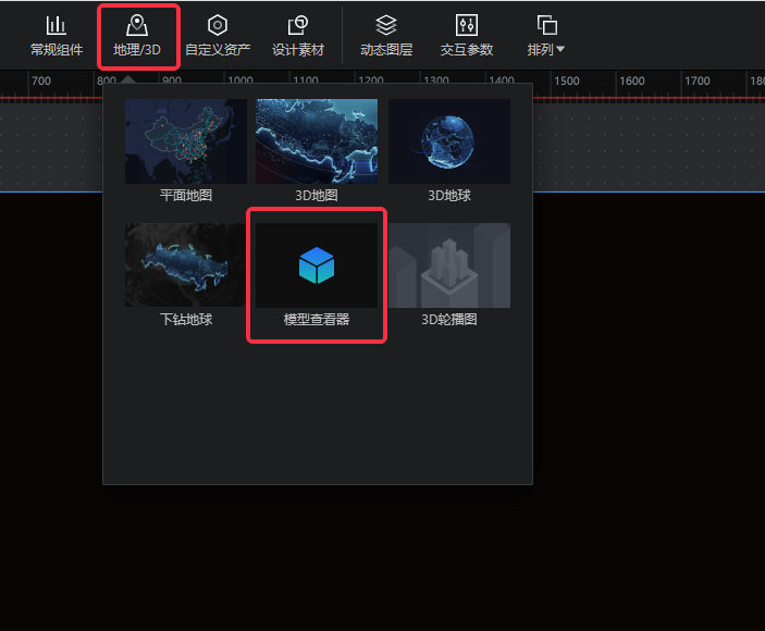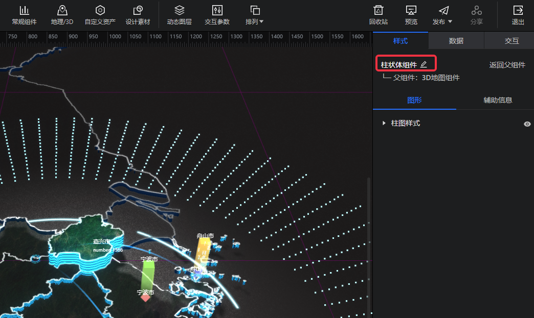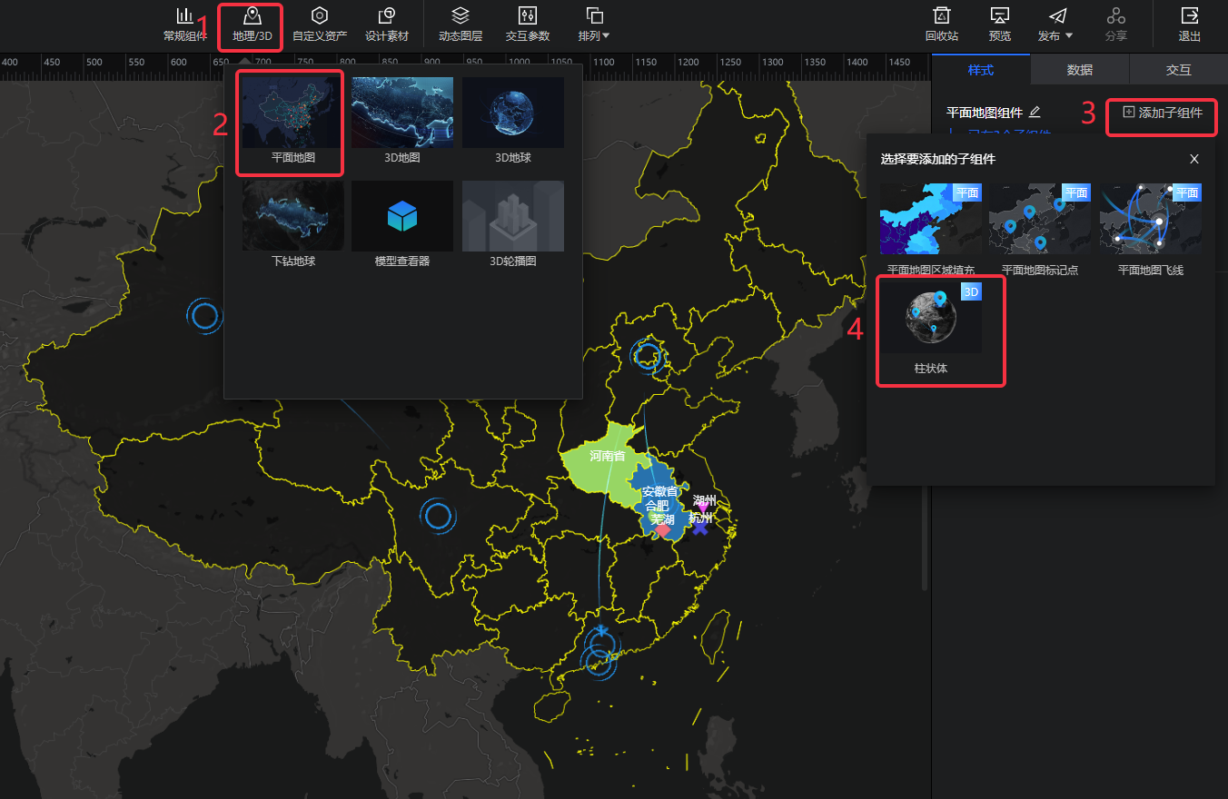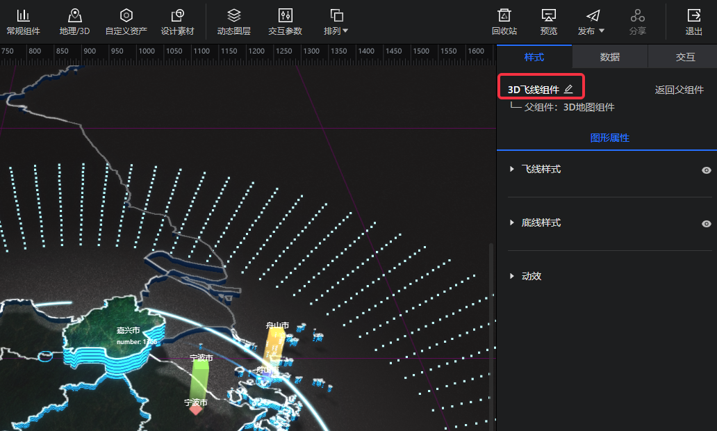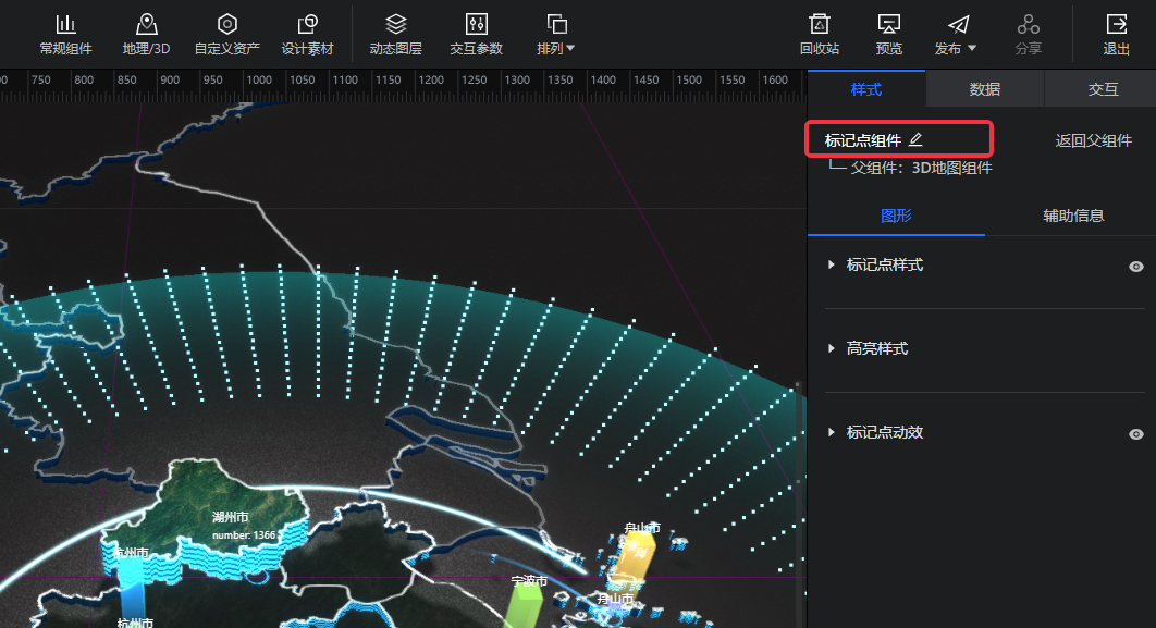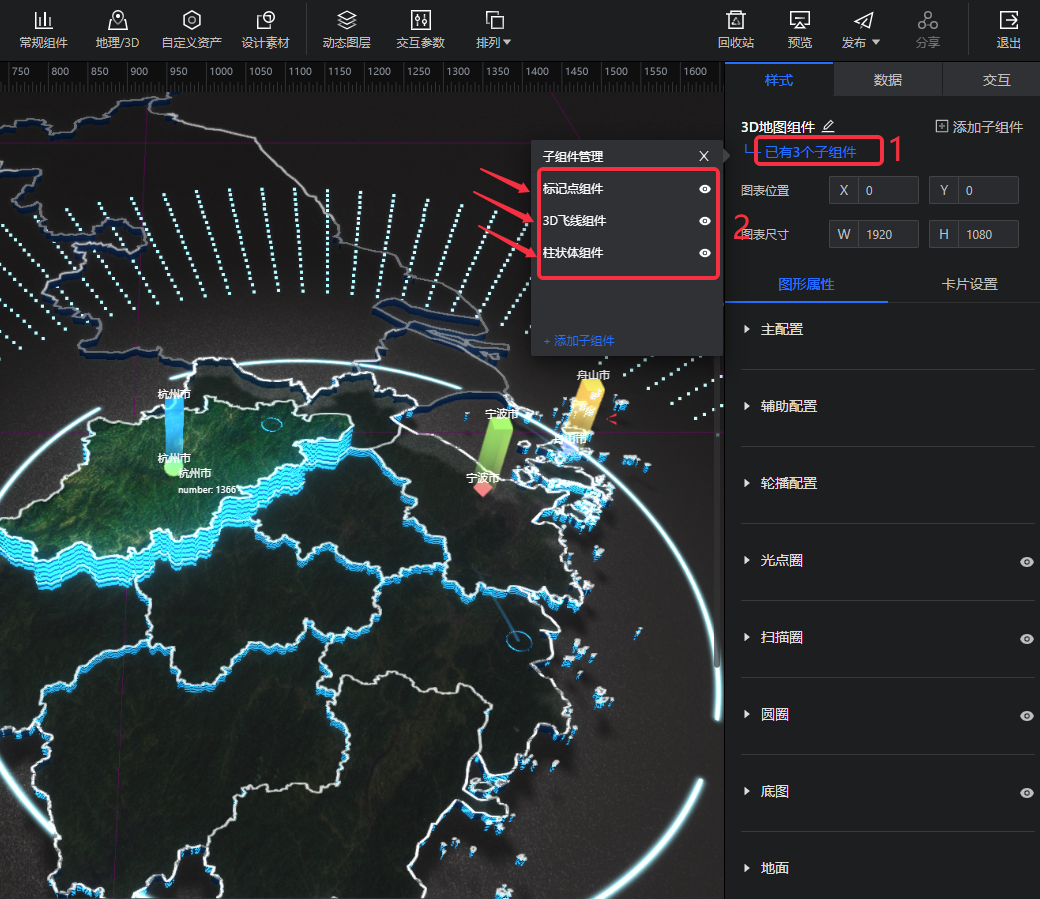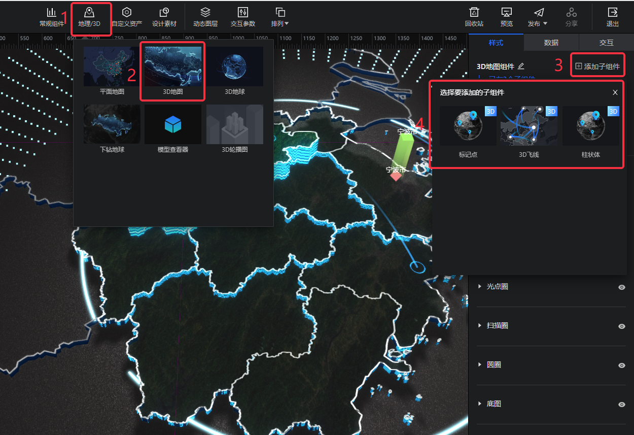 添加3D地图,可以添加标记点、飞线、柱状体子组件