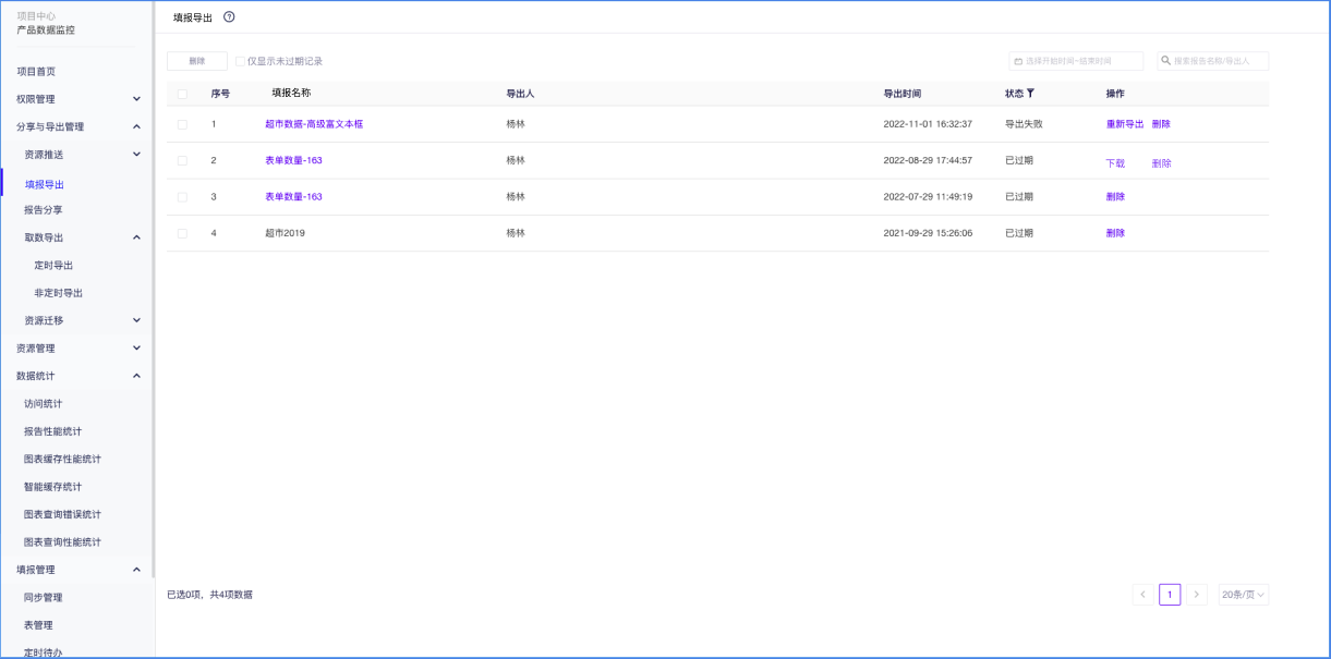 (1)项目中心-分享与导出管理:新增”填报导出“模块,项目管理员可以看到所有导出内容;其他用户仅可以看到自己的导出。