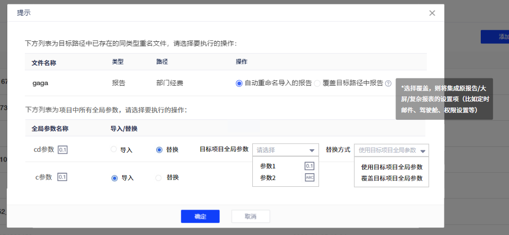 在资源导入时,弹窗显示所有当前资源全局参数。可对其进行以下操作:全局参数支持设置替换,替换方法包括“使用目标项目全局参数”或“覆盖目标项目全局参数”。