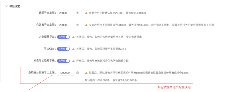 (2)导出数据超过100万条(具体数据可配置)时可分成多个文件打包,之后进入导出管理页面下载。拆包依据在后台管理配置:产品后台-系统拆分数据导出上限(此功能仅私有部署版本客户可用)。