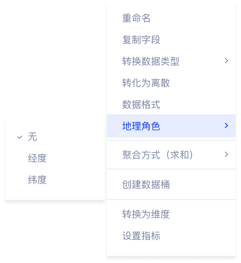 - 整数型、小数型度量字段支持修改为经纬度地理角色,入口在[数据格式]下方新增[地理角色]功能,默认为无