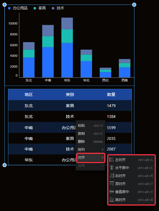 (2)数据对齐:图表标题列支持垂直对齐方式,图表、表格、交叉表的维度支持垂直和水平对齐