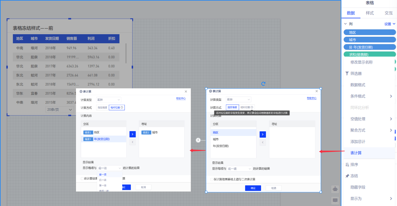 - 计算类型:对齐图表组件的表计算,提供差异、百分比、差异百分比、总额百分比、累积和、移动计算、排名