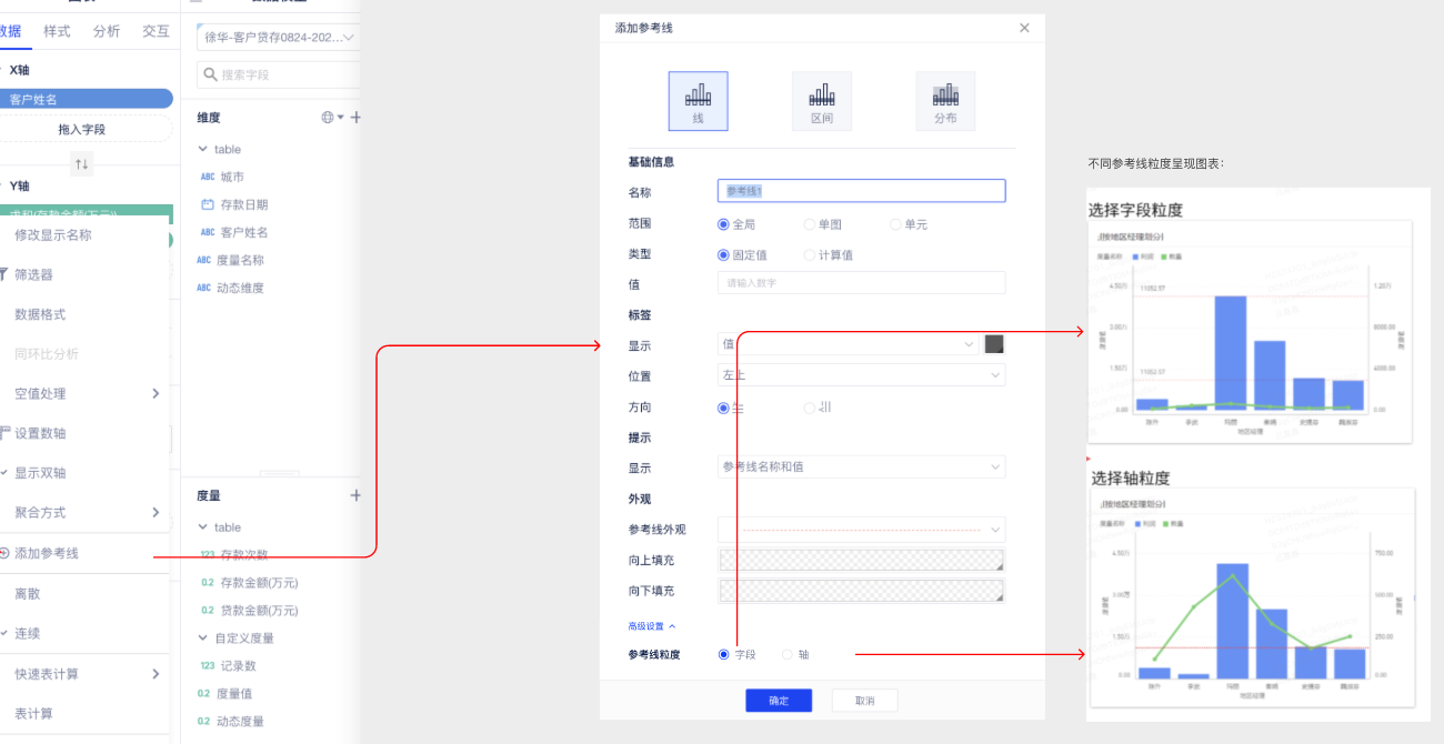 (5)参考线:支持设置参考线粒度(粒度为“轴”时,同一个字段(含“度量值”)拖入多次,可以分别设置参考线)