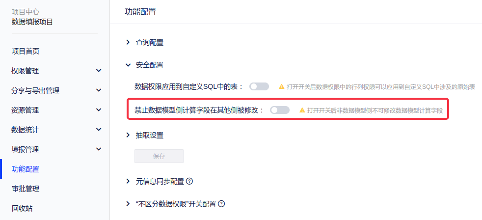 (1)项目中心:安全配置增加配置项,可禁止数据模型中设置的计算字段在其他地方(如报告、取数等)被修改