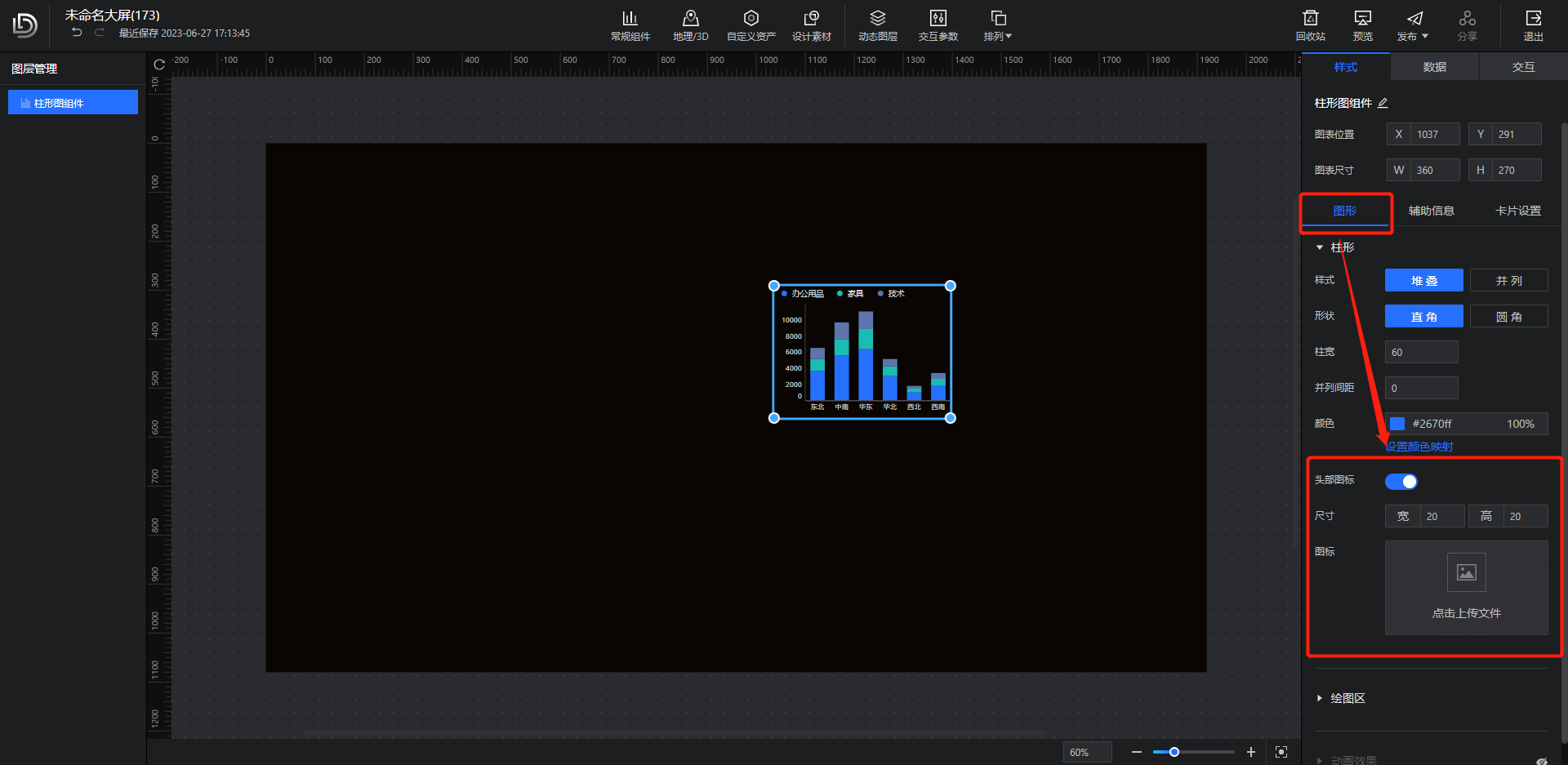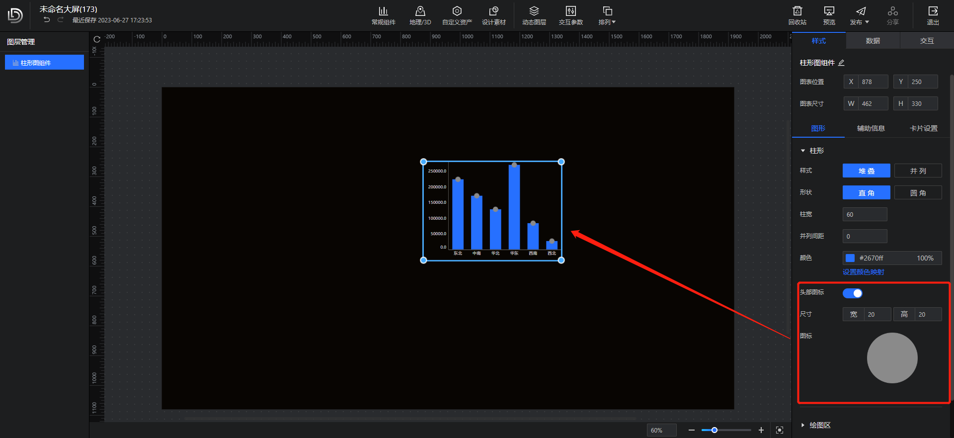 在图表的图形样式配置界面开启头部图标,上传图标图片后,图标头部将出现相应图标样式