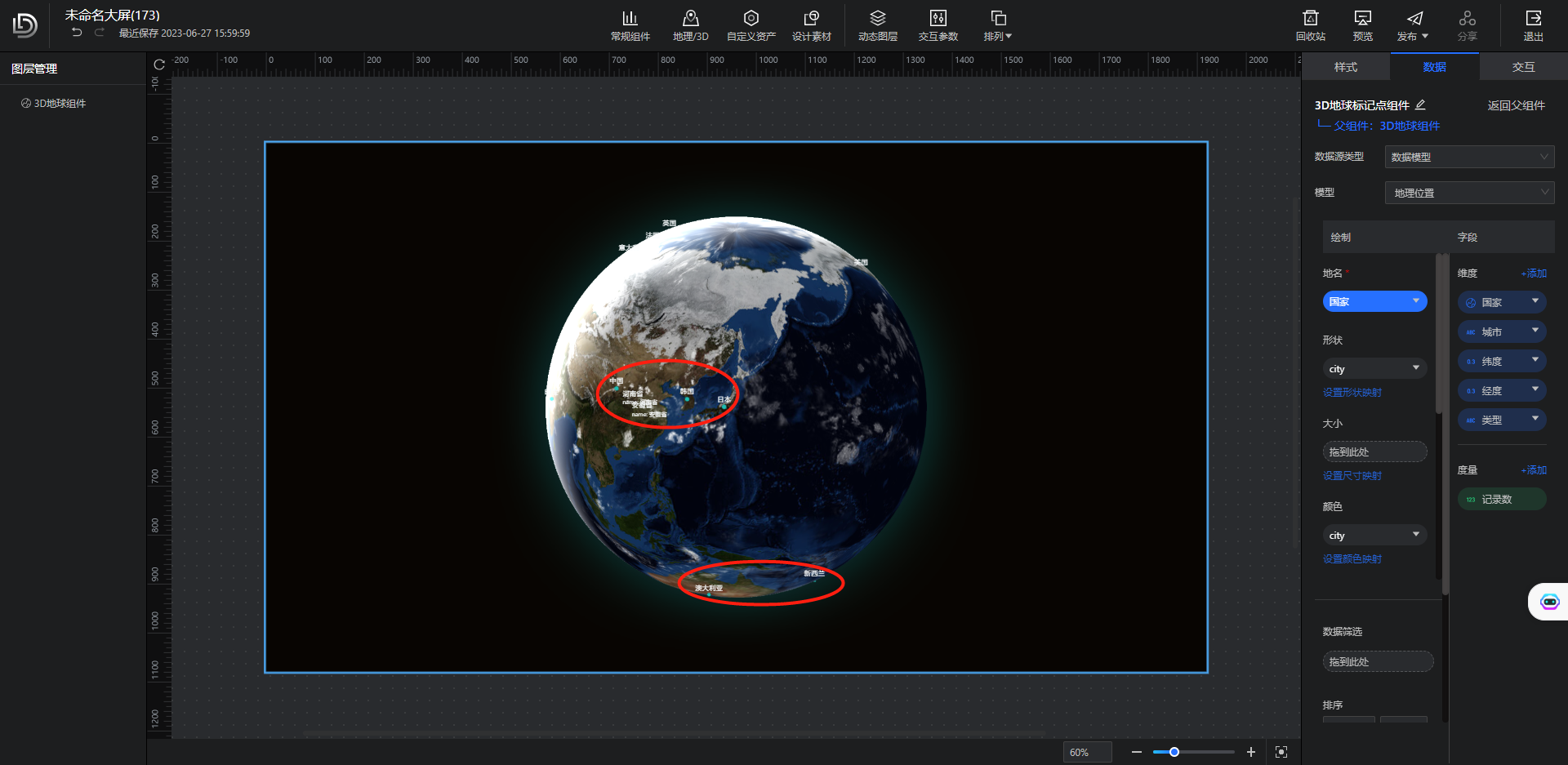 以设置”国家“字段的地理角色为例,配置完毕后,数据集中记录的国家将在”地球组件“上被标记出来