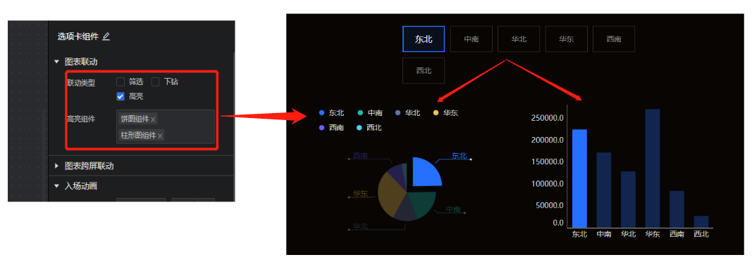 (3)图表间的联动方式增强,支持筛选、下钻、高亮三种联动方式