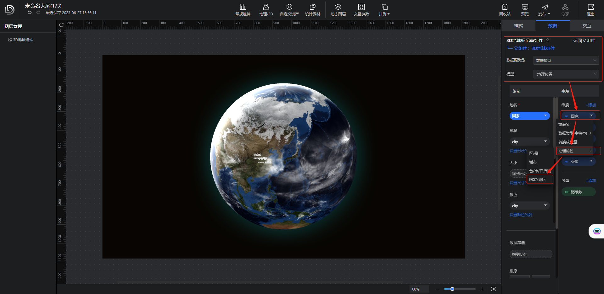 以“3D地球标记点组件”为例,确认数据源后,在“数据配置“区域的”维度分析“中,选择需要配置地理角色的字段进行地理角色配置