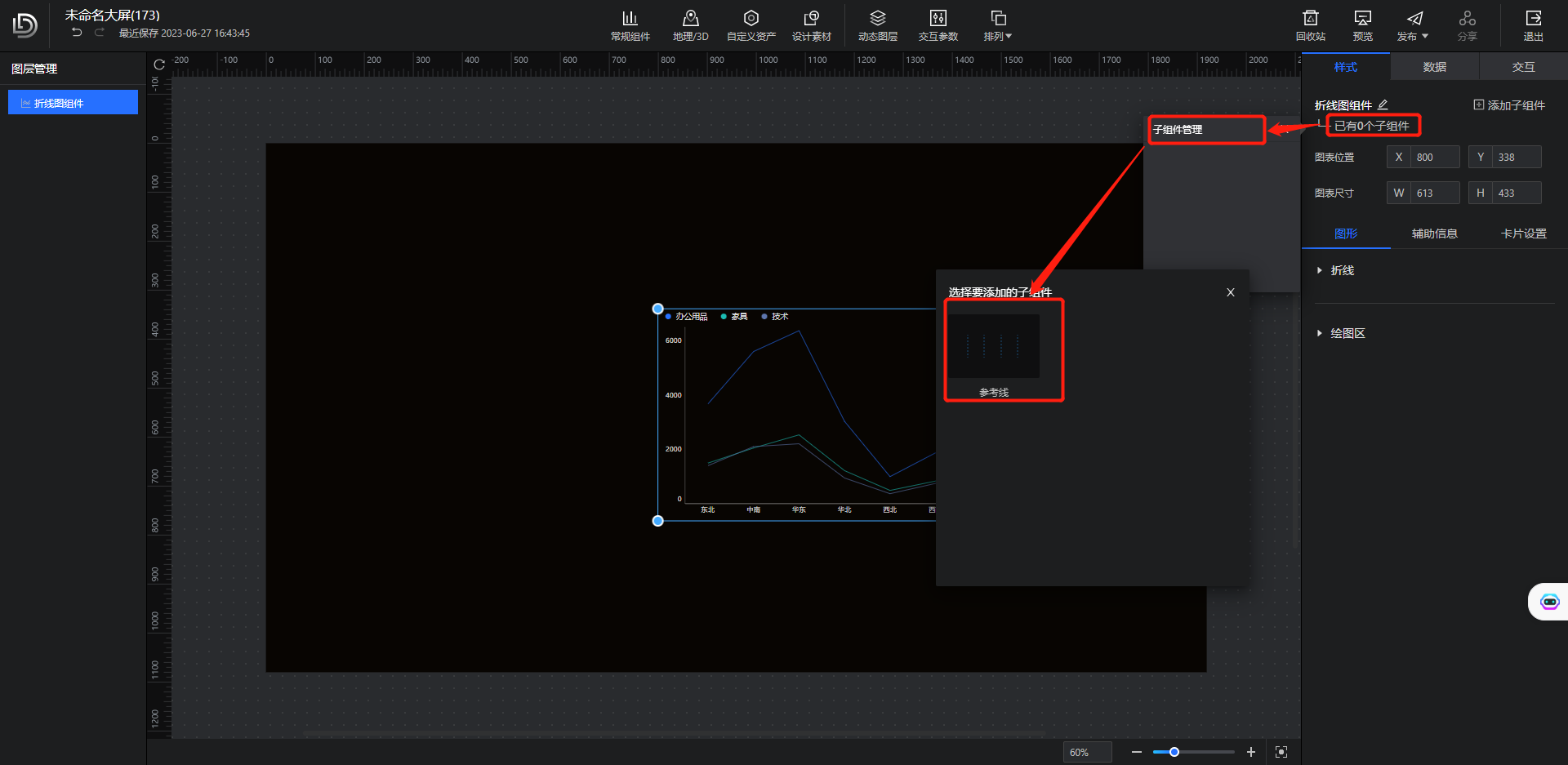 (5)折线图组件支持添加参考线子组件