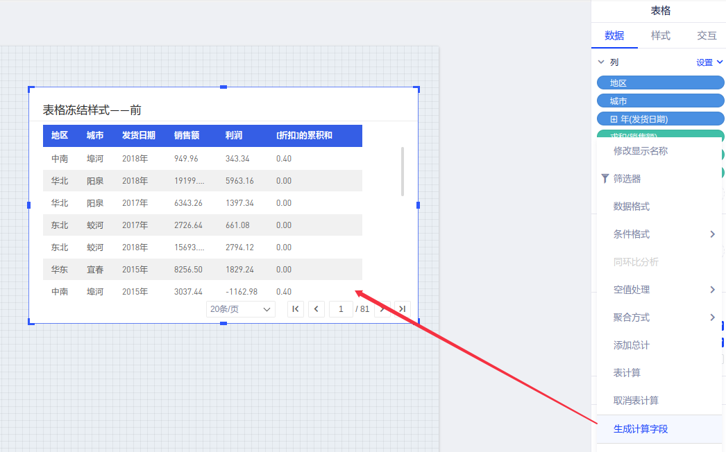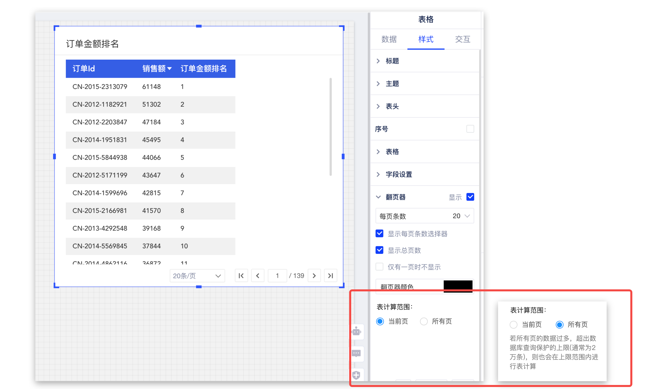 (6)表计算:表计算支持对所有分页的数据进行计算(最多2w行)