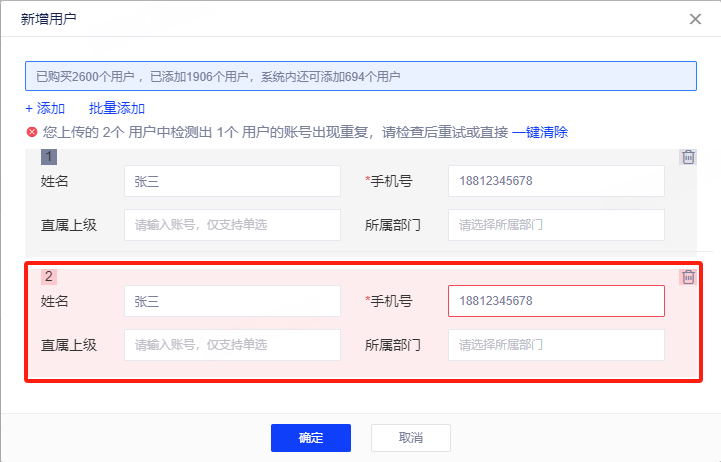 【企业域】批量添加用户时,重复用户高亮提示且支持一键清除重复用户。