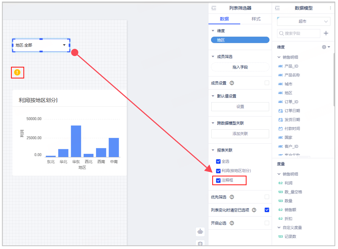 注释框的度量可通过筛选器控制,列表筛选器可关联注释框进行筛选。