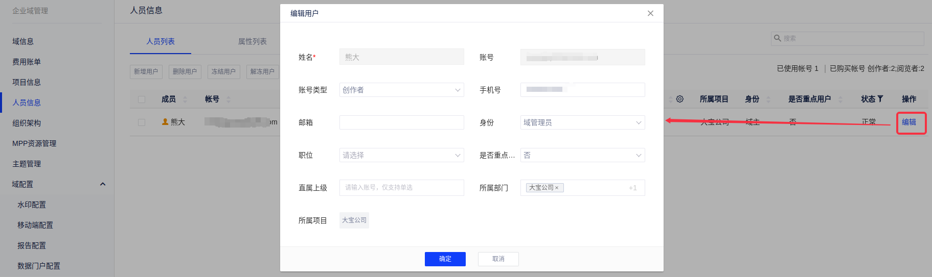 由域主或域管理员进行设置,【企业域管理-人员信息-人员列表-编辑】