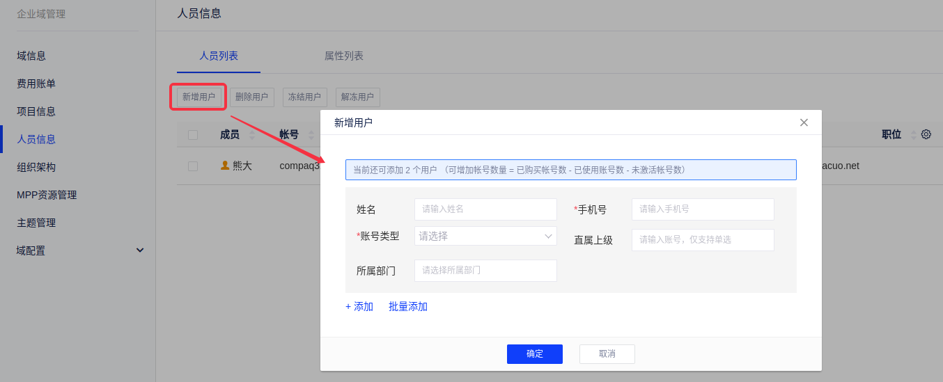 第一步:推荐在【企业域管理-人员信息】界面增加用户,输入用户的姓名、手机号(或邮箱)并设置账号类型;