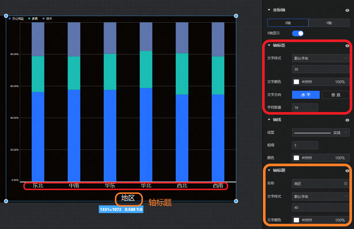 - 坐标轴:设置是否显示坐标轴,支持X、Y轴分别设置,以及设置轴标签、轴线和轴标题。