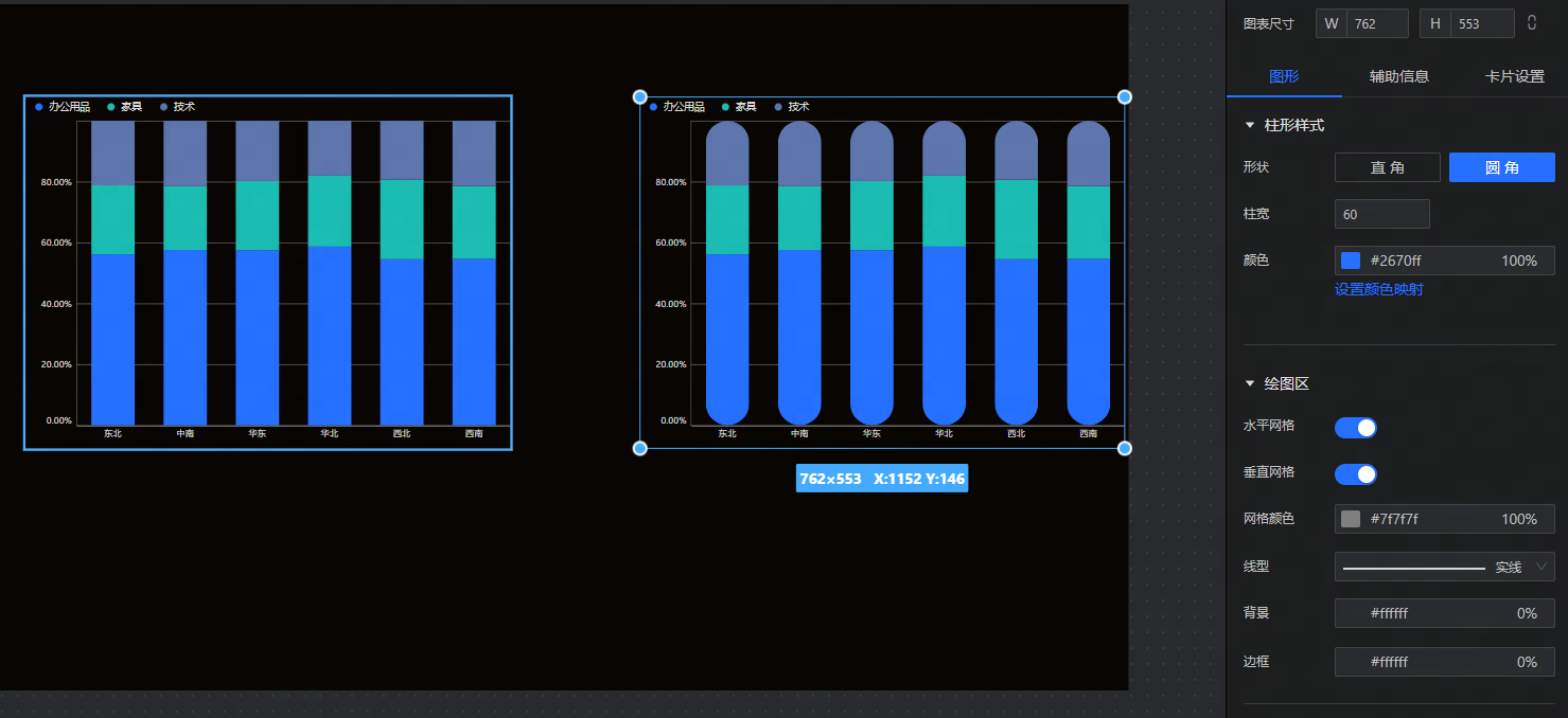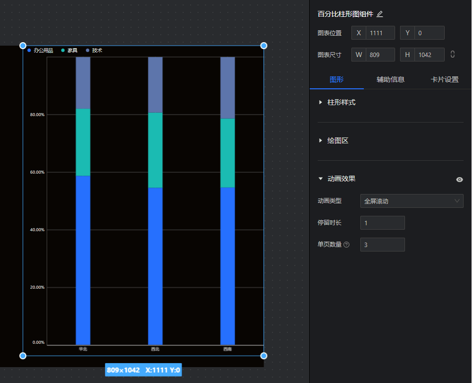 - 维度:设置百分比柱形图的维度字段,如下图所示为“地区”。