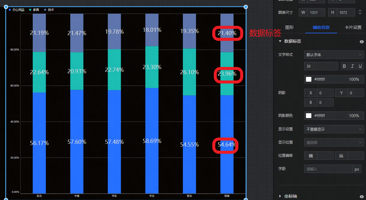 - 数据标签:设置是否显示数据标签,以及设置文字样式、显示设置、位置、偏移和字距。