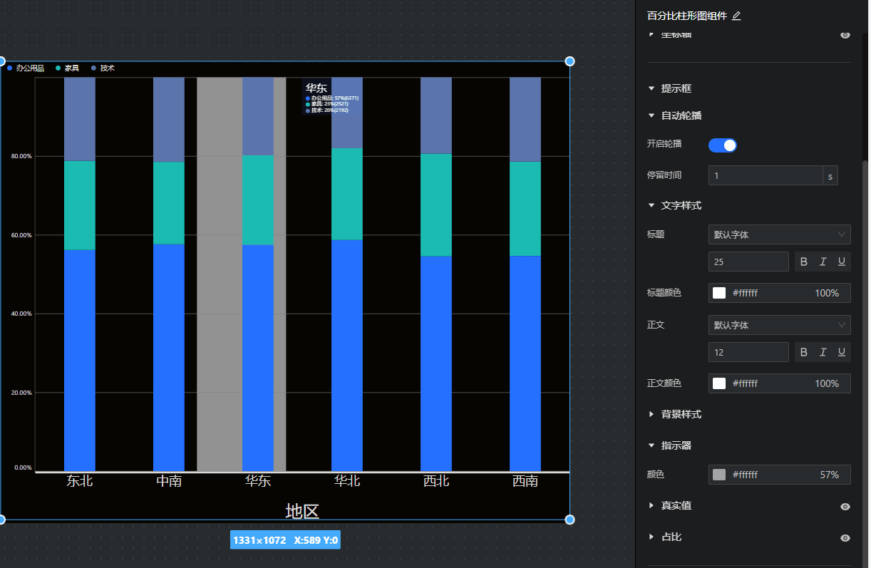 - 提示框:设置自动轮播、文字样式、背景样式、指示器、真实值和占比。