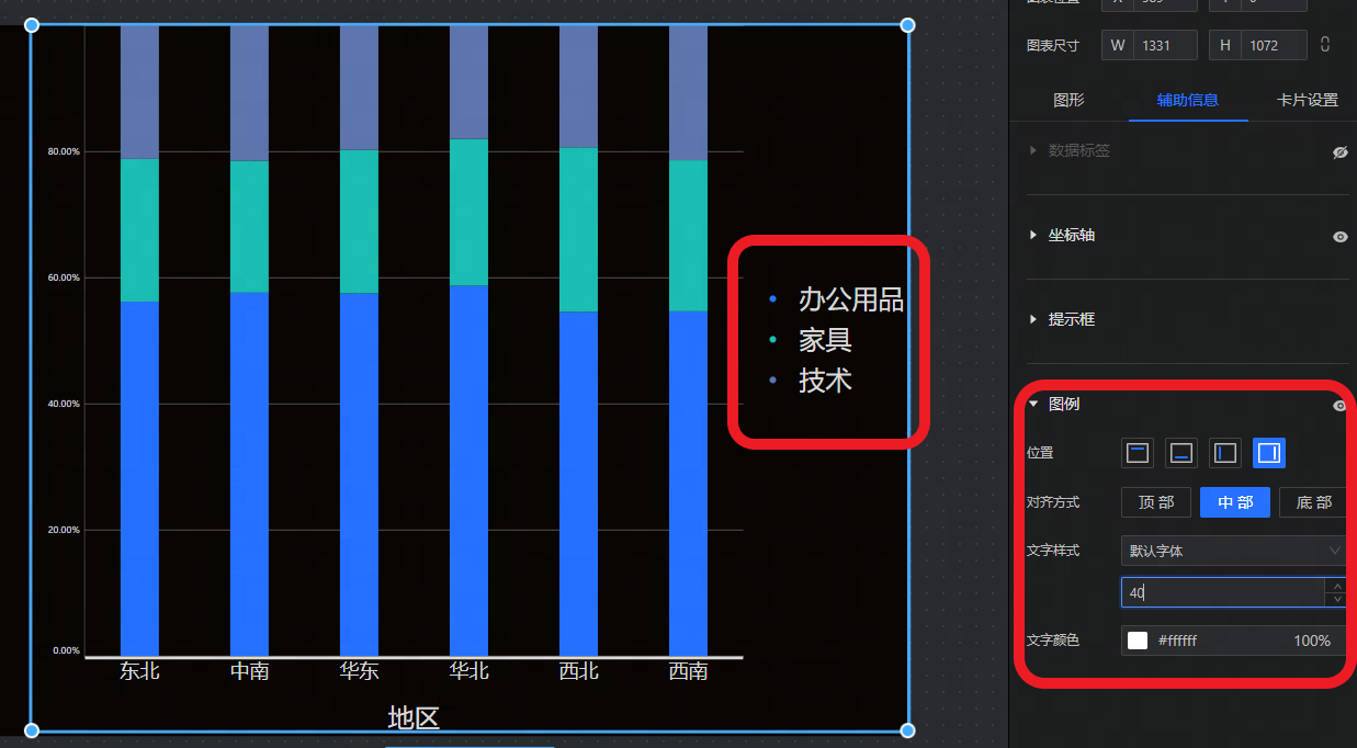 - 图例:设置图例位置、对齐方式、文字样式和文字颜色。