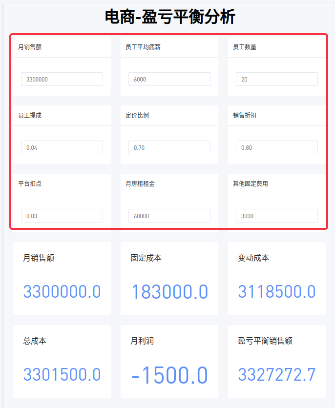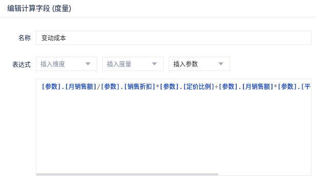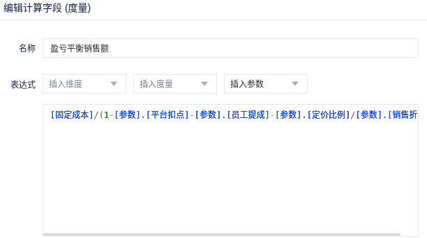 表达式:[参数].[月销售额]/[参数].[销售折扣][参数].[定价比例]+[参数].[月销售额][参数].[平台扣点]+[参数].[月销售额]*[参数].[员工提成]
