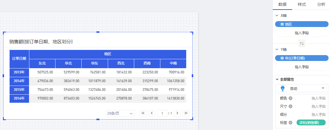 但如果我们对调一下,把“地区”变为分区,“年”变为寻址,那么我们得到的就是每个地区下各年的销售额排名,如下图所示: