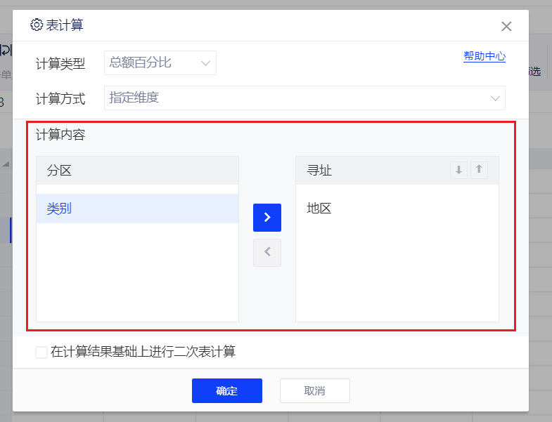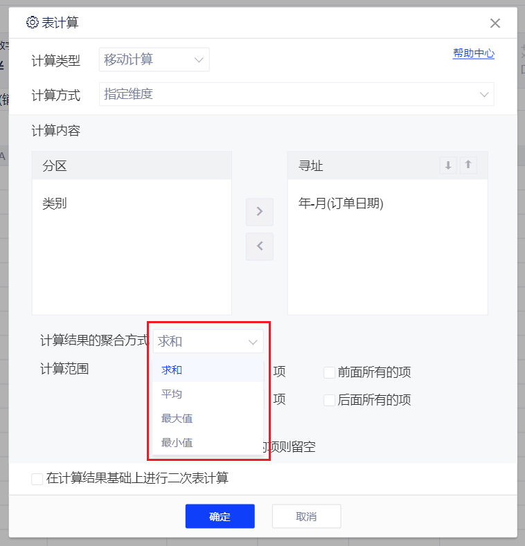 计算方式包括指定维度、表(横穿)、表(向下)、表(先横穿再向下)、表(先向下再横穿)以及单元格。