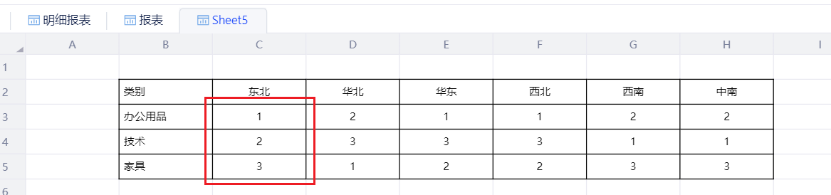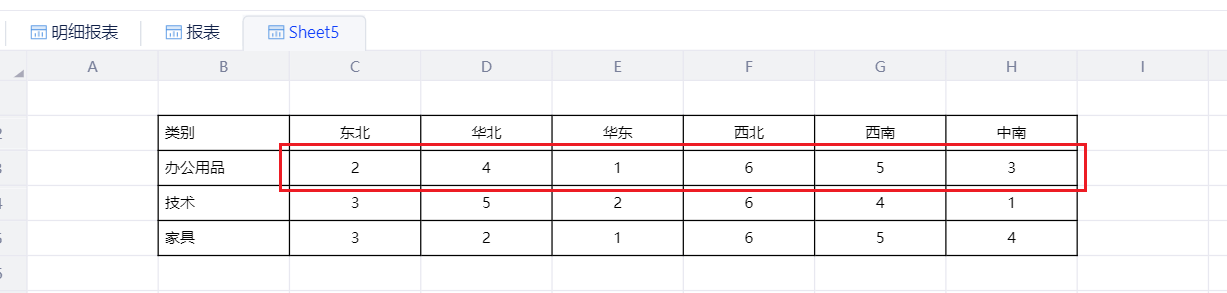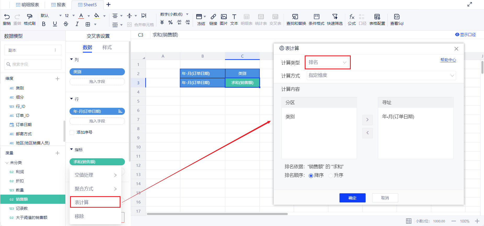 比如我们需要在对每个类别的地区销售额进行排名,分区就是“类别”,寻址是“地区”,如下图所示: